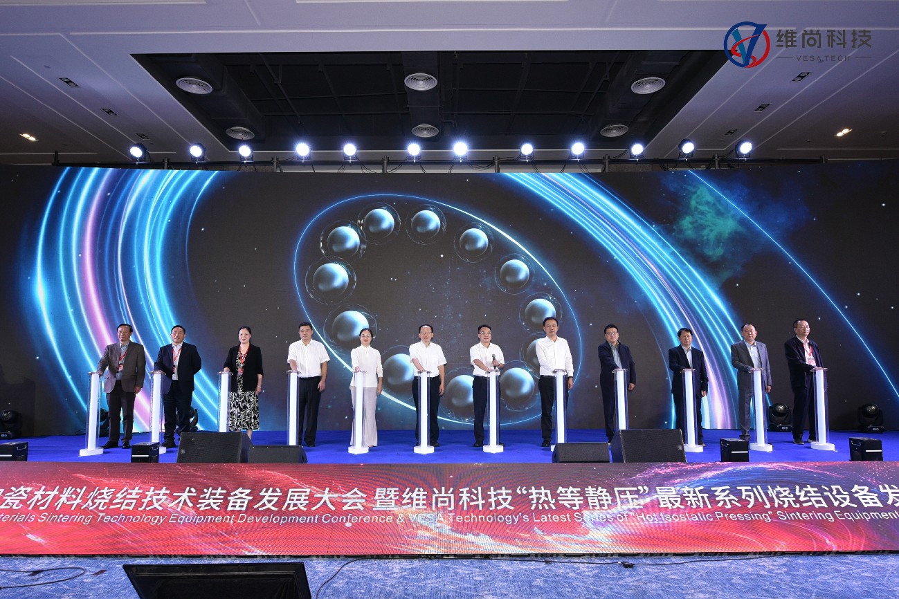 隨后,高光時刻來臨!株洲市委常委、市委秘書長楊英杰攜市、區(qū)級相關領導,行業(yè)協(xié)會負責人與柴神洲董事長共同推桿 —— 隨著啟動裝置緩緩點亮,本次盛會正式啟幕,維尚科技 “熱等靜壓” 新品也同步揭開面紗!這一時刻,不僅是維尚發(fā)展的新起點,更標志著國產先進陶瓷裝備邁向更高質量的發(fā)展階段!